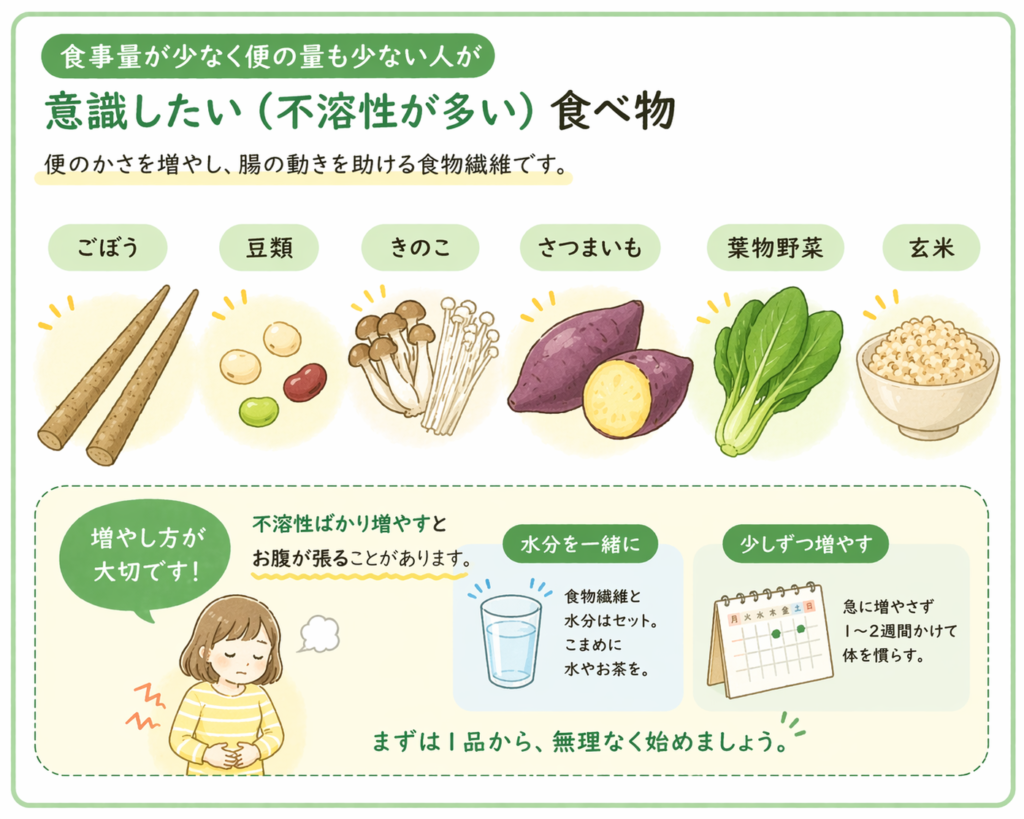 食事量が少なく、便の量も少ない人が意識したい(不溶性が多い)食べ物
