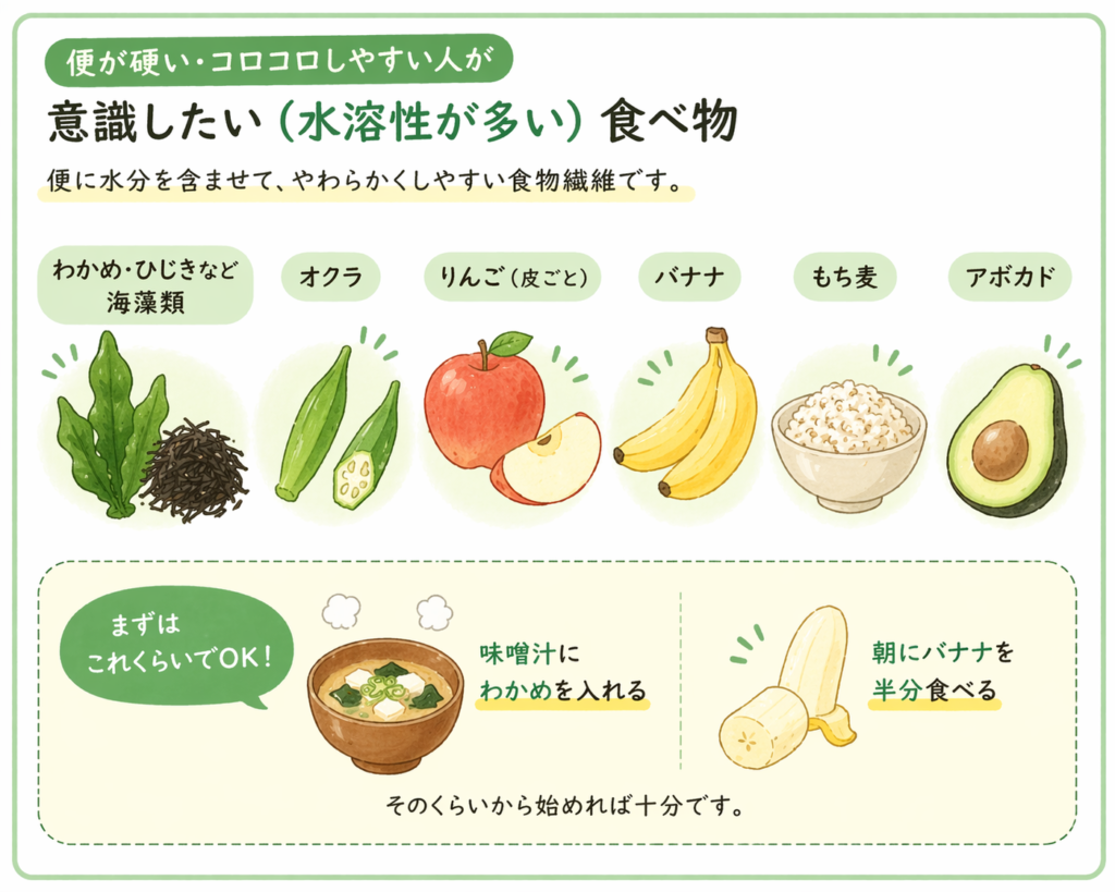 便が硬い・コロコロしやすい人が意識したい(水溶性が多い)食べ物