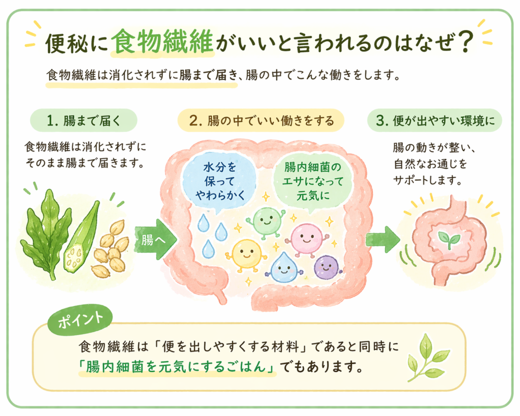 食物繊維は、消化されずに腸まで届く成分です。腸の中で便の材料になったり、水分を保ったり、腸内細菌のエサになったりして、便が出やすい環境をつくる手助けをします。