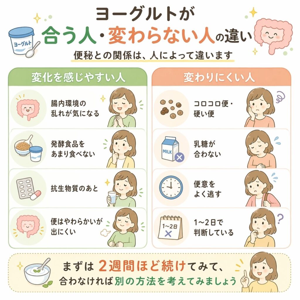 ヨーグルトは腸にやさしい食品のひとつですが、全員に同じように合うわけではありません。便秘の状態や体質、食べ方によって、変化を感じやすい人とそうでない人がいます。